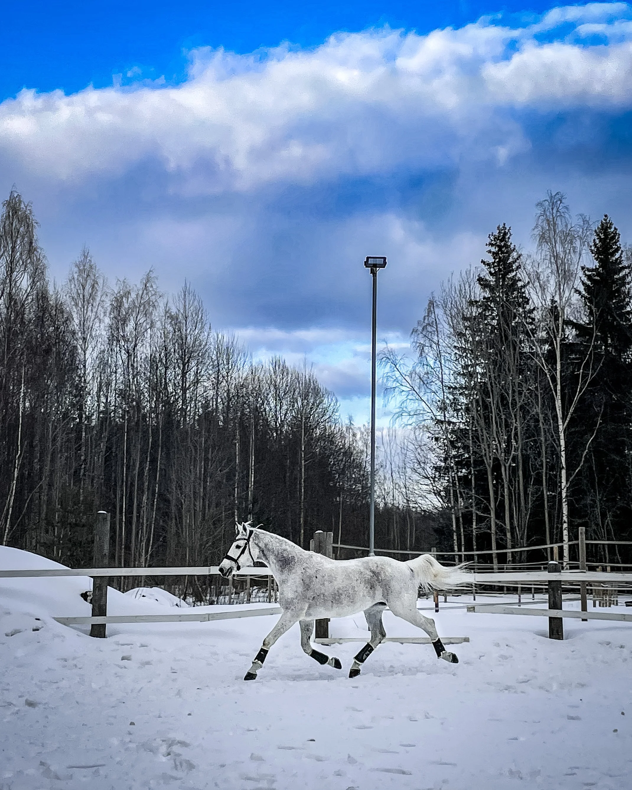 I learned more from Eden than from any horse I have ever ridden. I got to experience how a working horse feels like, I learned how a horse should move with small aids, I got to try unfamiliar and difficult dressage movements and I jumped my biggest fence (115 cm). Which is also when I fell off Eden's back for the first time. Fortunately, there were only three falls in total during our 5 years together. I jumped with Eden for the first time the following spring. Fanny had made a set of exercises for herself and made me jump them with Eden. The last fence rose lap by lap and was suddenly so high that Eden opened her hind legs behind her in the jump, which was a new feeling for me. The jump arc changed and I crashed into the saddle as Eden came down, lost my balance and spun under Eden's neck. I thought I would end up under her hooves, but Eden stopped at that moment like there would be a wall in front of her. From that moment on, my trust in Eden changed completely. Eden didn't want anything to happen to me. I dared to ride her bareback for a change, which allowed me to practice my seating even more. Eden seemed to enjoy riding bareback and always behaved like an angel. If I faltered, Eden would correct herself under me or immediately start walking or stop. Eden, who had been throwing riders of, seemed completely absent.