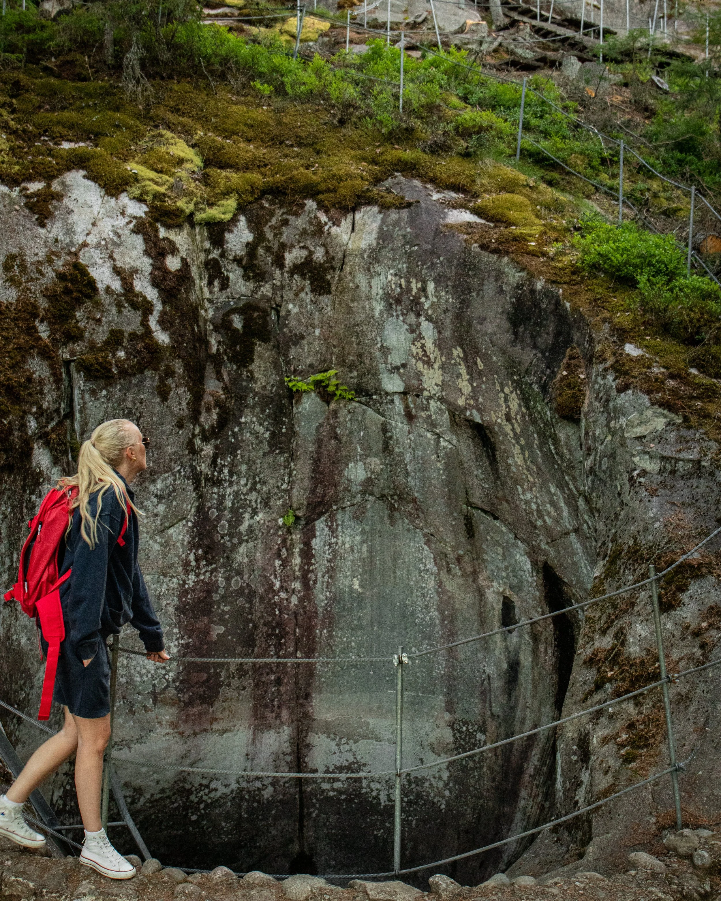 // The place is easy to find and you get to enjoy the beautiful countryside and river valleys while driving. There’s a big parking lot where you also find a map of the area. There is a 500 m long footpath through the woods to the Giant’s kettle. I decided to take the scenic route, which is little bit longer and marked with blue ribbons. On the path to the Giant’s kettle you have to lift your feet up stairs, and over rocks and roots. I highly recommend you put some insect repellent on you by the car as you will not be alone during this walk.